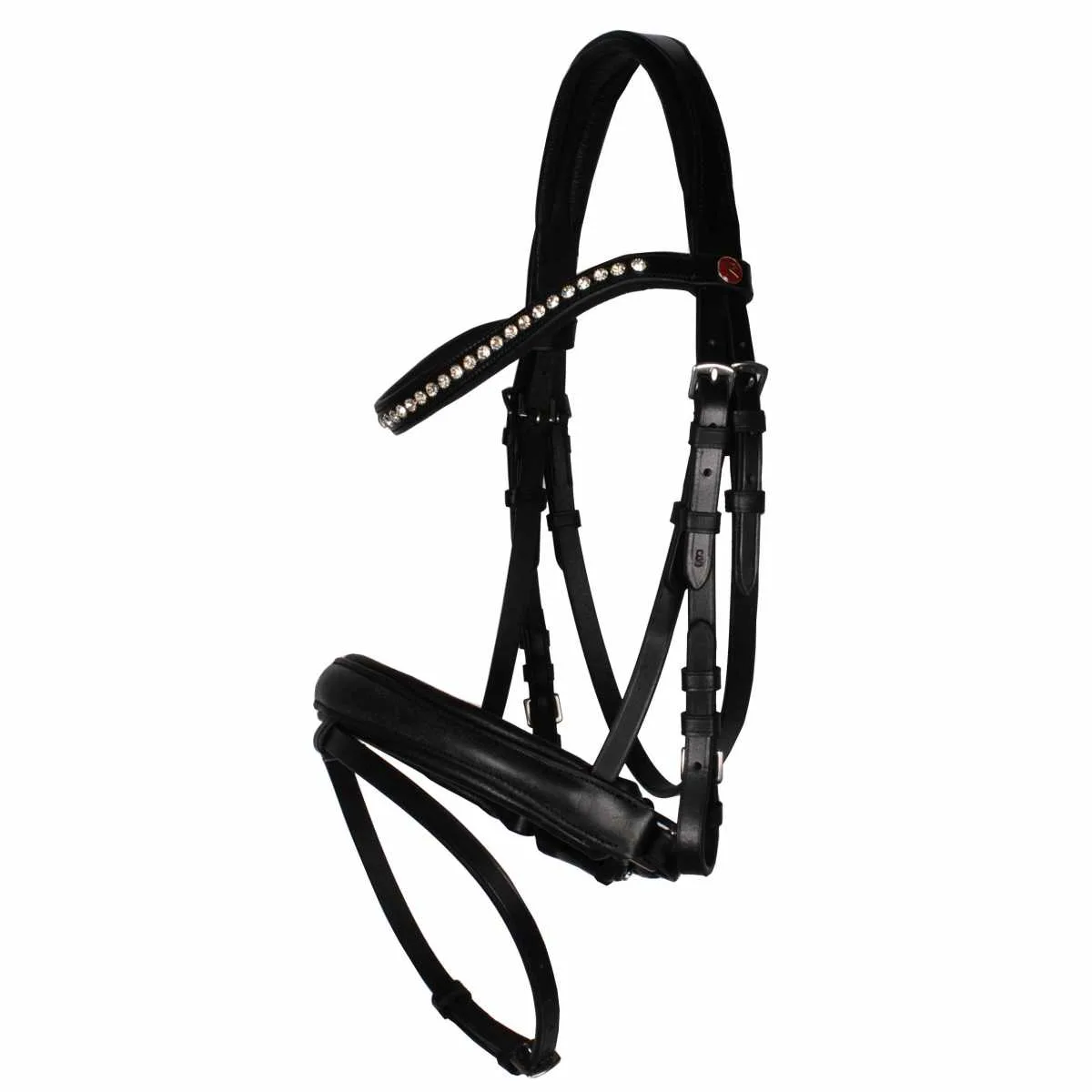 Het Rossner Dimaro Hoofdstel is zacht onderlegd en heeft strass stenen in de frontriem. Het hoofdstel wordt geleverd inclusief springteugel.… Lees meer