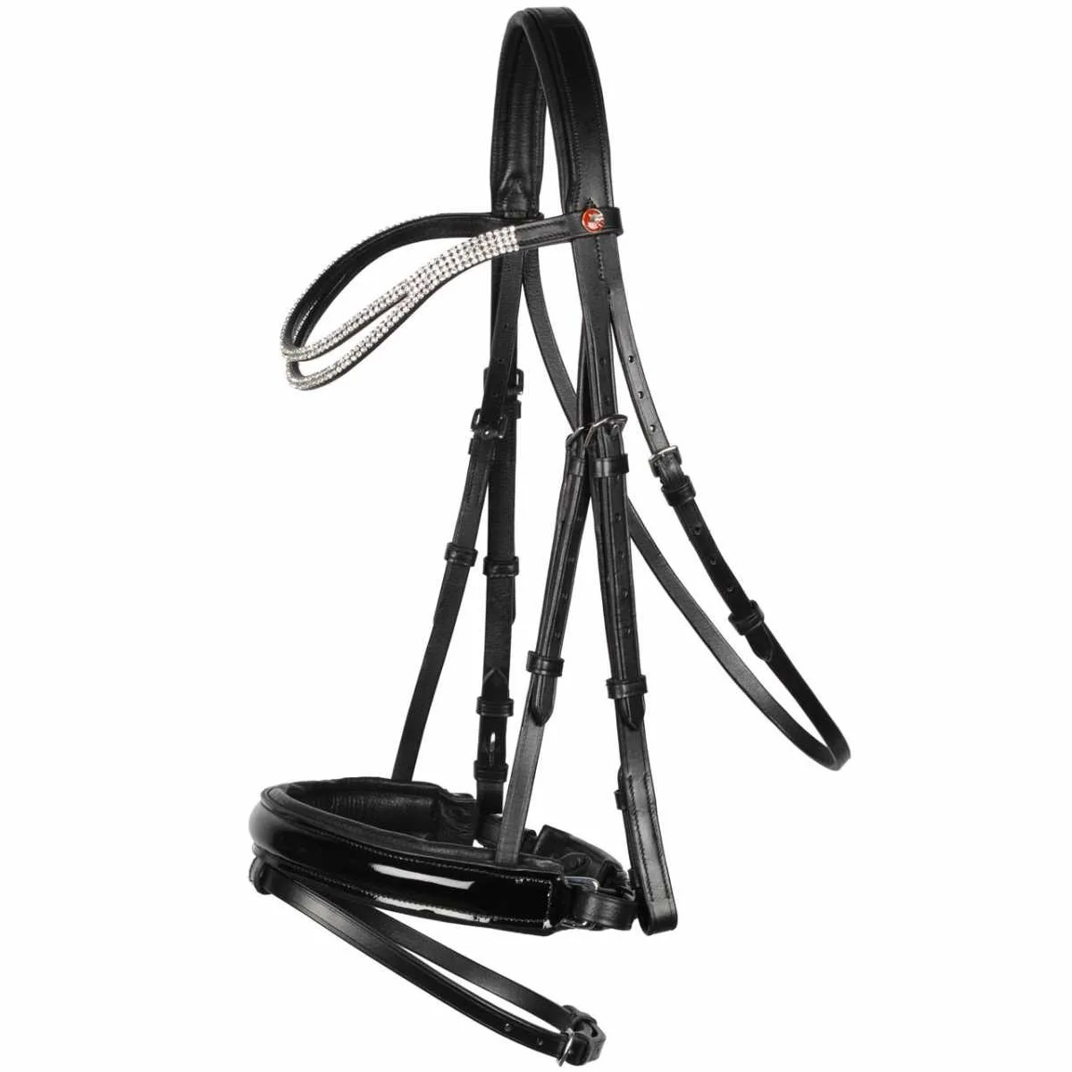 Hoofdstel van Rossner met gecombineerde lakneusriem, luxe frontriem met strass en springteugel.… Lees meer