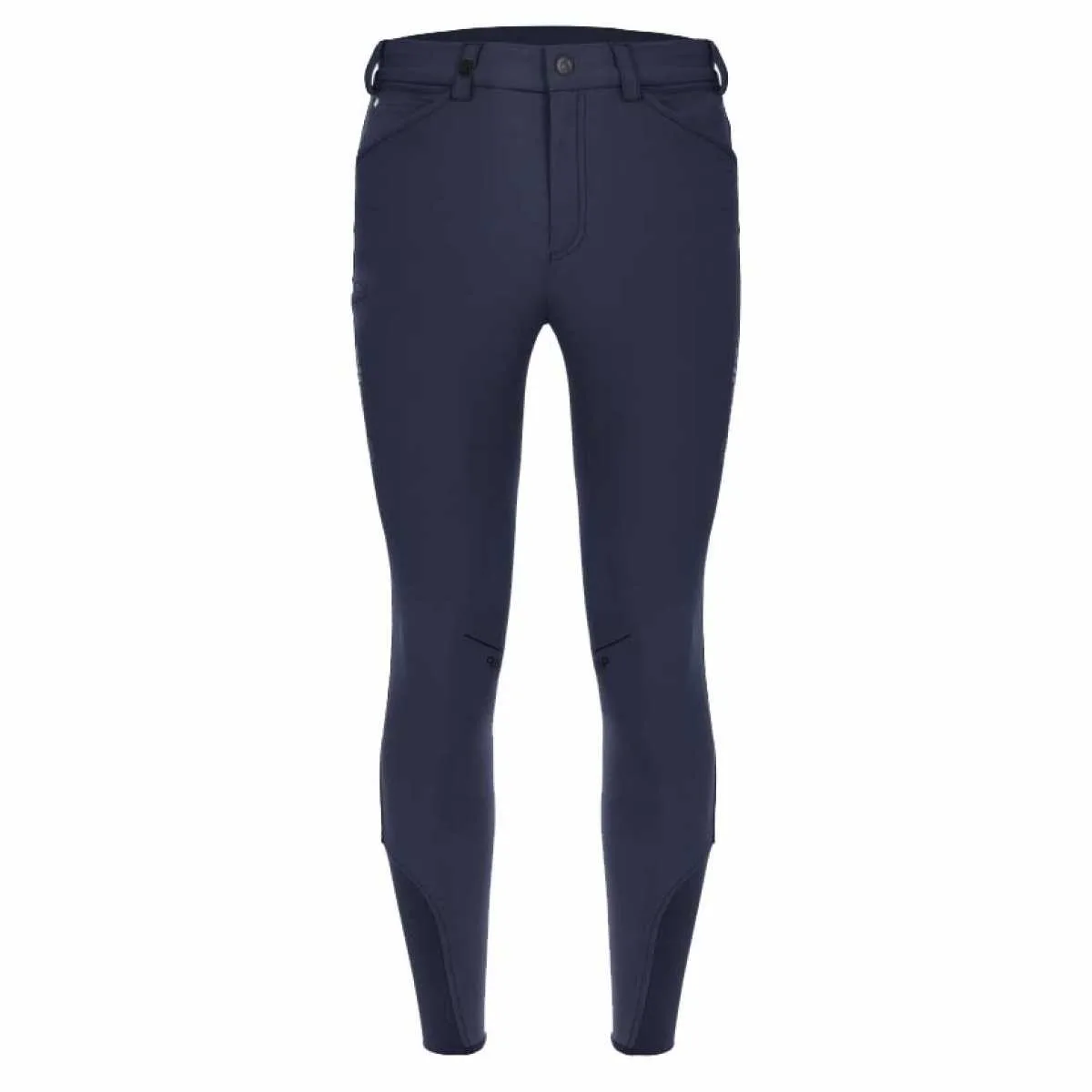 – Sportieve heren rijbroek – Siliconen grip vlak bij de knie – Jeanszakken op voorzijde – Zwarte details – 91% Polyamide en 9% Elastaan