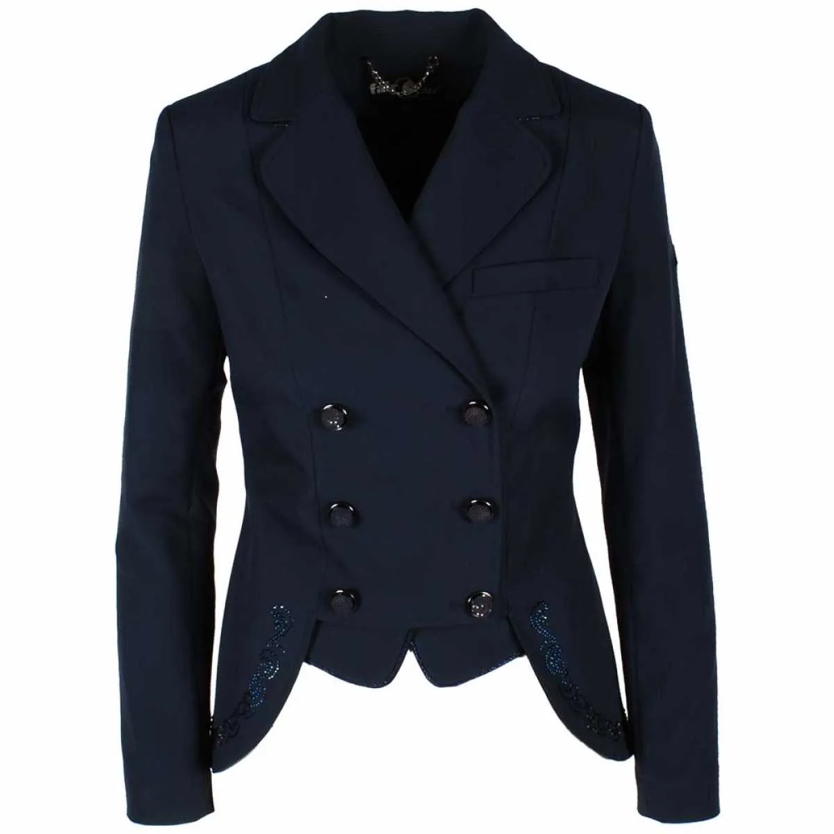 Het Fairplay Lexus Chic Rijjasje is een chique korte slipjas. Het rijjasje heeft een dubbele rij knopen, met glitters erop. De jas voorzien van een chique patroon van strass steentjes en op de rug zijn deze ook te vinden. Op de achterzijde zit een enkele split, wat fijn is tijdens het rijden.… Lees meer